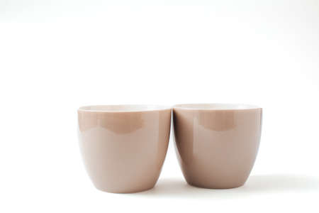 Empty beige coffee ceramic cups on isolated white background, cut out