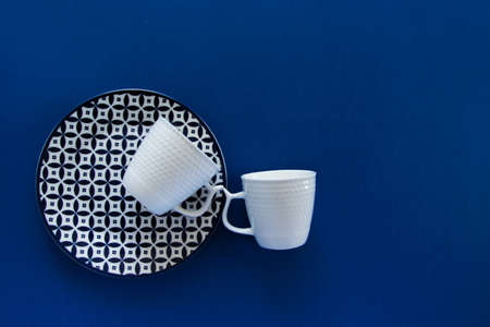 Overhead flat lay view of clean tableware (blue plate and white coffee cups) on dark blue background