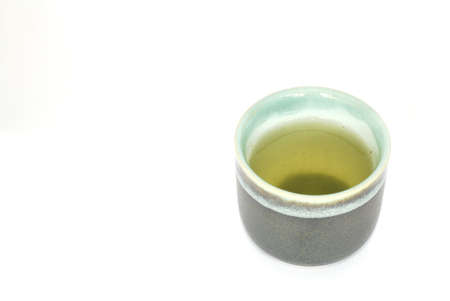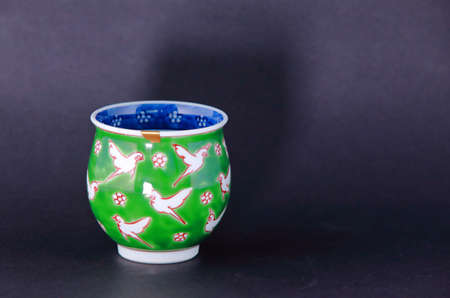 Stock photo of white color ceramic tea cup isolated on blur background. blue color flower with green color leaves design on cup. Picture captured at Bnaglore, Karnataka, India. focus on object.