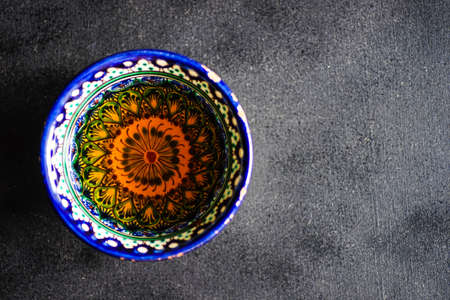 Traditional uzbekistan ornament on bowl with tea as a tea concept