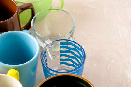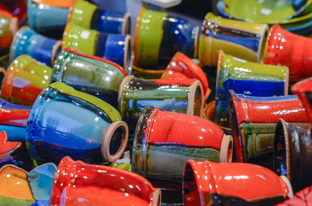 Many colorful ceramic hand made cups, top view. Handmade craft