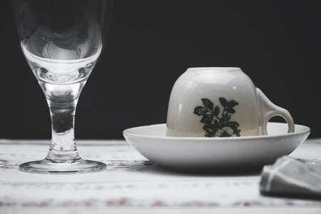 on the table there is a wine glass and cup Coffee, in accordance with the romantic mood and there is space for writing