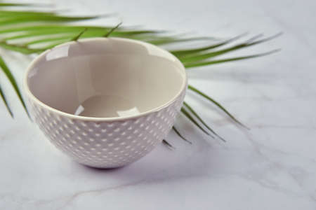 Modern trendy empty bowl on marble background. Minimalisticcomposition with tableware and tropical leaves. Top view, mockup for recipe, menu, culinary classes, cooking blog.