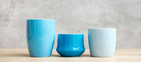 Blue coffee cup and tea mug on wood table background in the morning, Blank copy space for text. International coffee day and daily routine concept