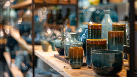 A cozy shop display of handmade ceramic cups and bowls on wooden shelves, captured in soft lighting, highlighting craftsmanship and artisanal quality.