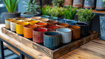 A beautiful assortment of handcrafted ceramic cups and mugs displayed on a rustic table. The colorful designs and intricate textures add charm to any setting.