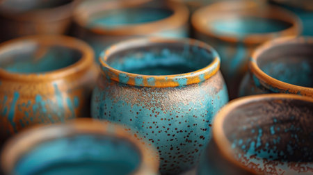Detailed close-up of handcrafted pottery, showcasing sustainable art with natural clay and glazes, highlighted by soft lighting.