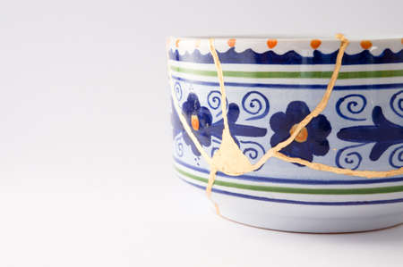Kintsugi pottery. Gold cracks restoration on old Japanese pottery restored with the antique Kintsugi restoration technique. The beauty of imperfections.