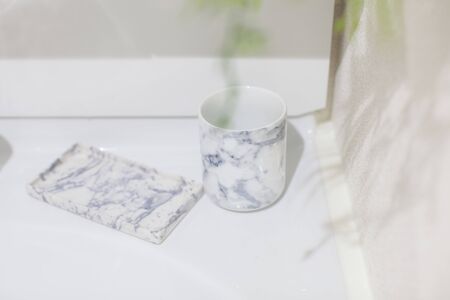 Realistic white ceramic mug with broken parts repaired using gold kintsugi placed on marble surface, natural light, concept of resilience and healing