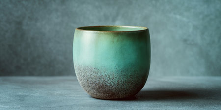 A beautifully crafted ceramic pot sits on a smooth, textured surface. The background features a calming blend of earthy tones, enhancing the pots design.