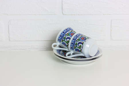 Two traditional Turkish coffee cups isolated on white brick wall background. High quality photo