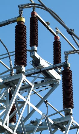 Electrical insulator and steel girders against the blue sky