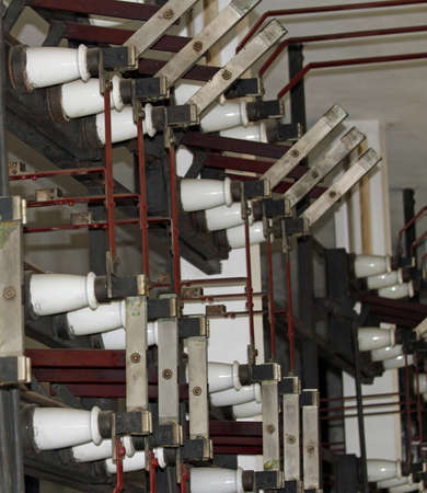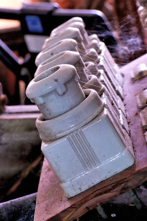 High voltage obsolete vintage electrical substation. Closeup on wiring, connections and insulators of a electrical substation.