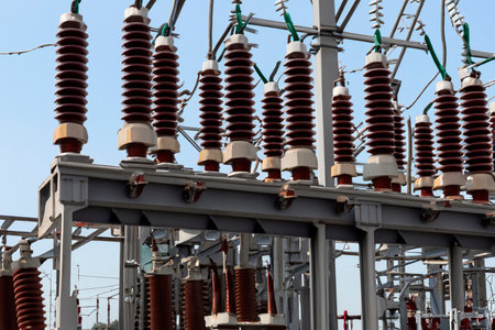 Many high voltage electrical insulators in power substation ,Energy supply to the community