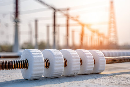 Close-up of sparkling glass disc insulators on a high-voltage power line against a clear blue sky, symbolizing energy infrastructure