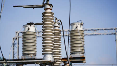 High voltage electric generator insulators.Detail of high voltage circuit breaker in a power substation.high voltage circuit breaker in a power substation on a summer cloudy day.Closeup.Copy space.