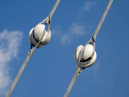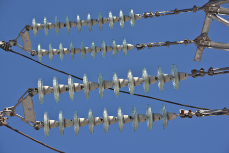 Insulators power lines. Photo of power lines against the blue sky.