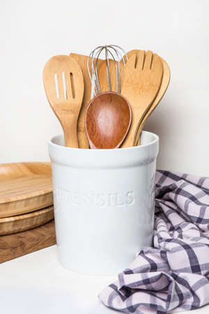 Bangkok, Thailand April 21,2020 a modern white ceramic cooking holder with wooden spoons and spatula home decor