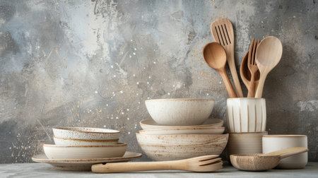 This image showcases an elegant arrangement of natural textured tableware and wooden utensils, emphasizing minimalist design and rustic charm. Perfect for home decor inspiration.