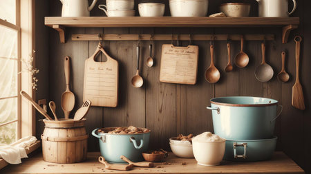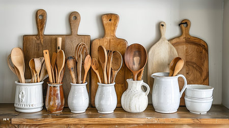 This charming kitchen scene features a collection of wooden utensils, a white pot, and rustic decor, creating a warm and inviting atmosphere for cooking.