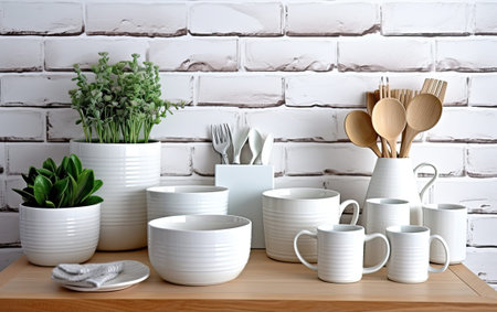 Beautiful kitchen background with different ceramic bowls,potted indoor plants. Front view. White brick wall