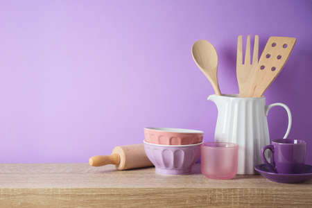 Kitchen utensils and dishware on wooden shelf. Kitchen interior purple background