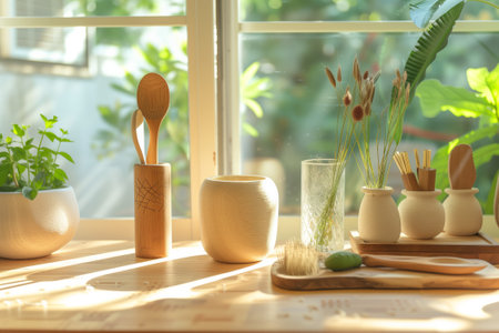 Stylish kitchen utensils on countertop embracing culinary art with wooden and ceramic cookware