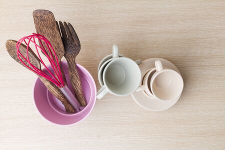 Top View of Coffee cup collection with kitchen ware on wooden background