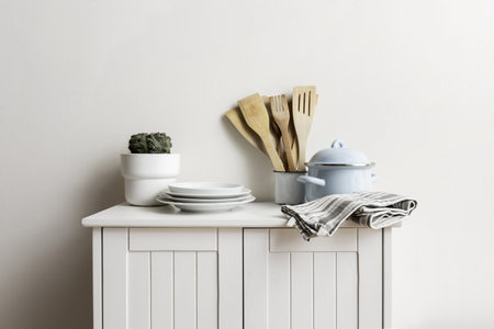 Kitchenware and utensils on a white shelf or counter. Banner with a white wall background and copy space. Kitchen cooking decor.