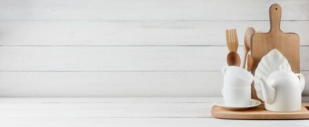 Blank space for kitchen wide banner concept. Kitchen background for mockup with spoon, teapot, cups, rolling pin, bowls on wooden table, white background.
