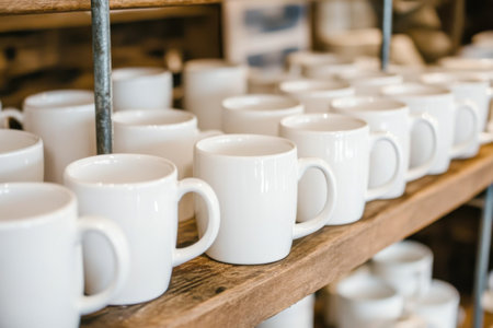 rows of plain mugs lined up on wooden shelves, created with generative ai