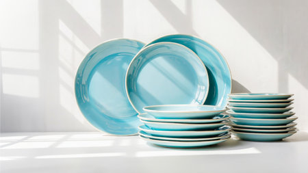 Stacked blue ceramic plates elegantly arranged in natural sunlight and soft shadows on white surface. Perfect for tableware design, dishware set presentation, kitchen branding and dishware advertising
