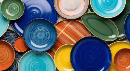 A top-down flat lay of a large collection of colorful handmade ceramic plates and bowls. The vibrant assortment of dinnerware in various shapes, sizes, and colors like blue, green, and yellow creates a cheerful and artistic background texture.