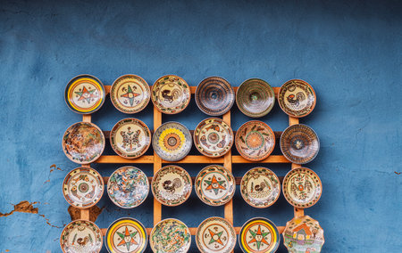 Collection of colorful Portuguese ceramic pottery, local craft products from Portugal. Ceramic plates display in Portugal. Colorful of vintage ceramic plates in Sagres, Portugal.