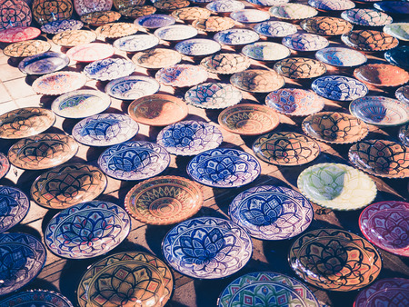 Collection of traditional Arabian ceramic plates. Copy space