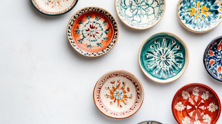 Top view of hand-painted ceramic plates, clean white background, copy space