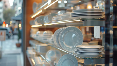 Elegant Porcelain Dinnerware Display in a Store Window. Concept of Luxury Dining, Home Decor, Ceramic Craftsmanship, and Fine Tableware.
