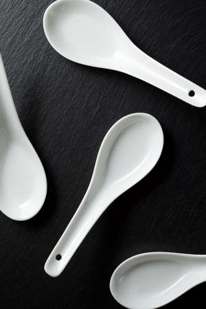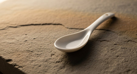 Resting showing white ceramic spoon resting on a textured stone surface with warm lighting and shallow depth of field. resolution