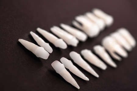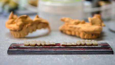 Dental prosthesis, artificial tooth. Photo of artificial teeth made in the dental laboratory.