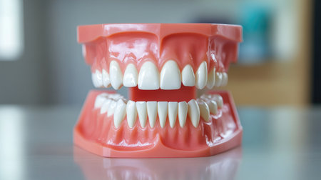 A model of human teeth in a dental office, used for patient education on oral health and anatomy