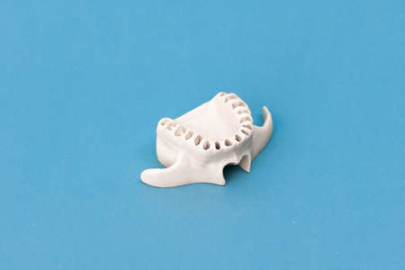 Dentist orthodontic teeth models with jaws opened on blue background