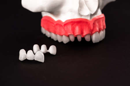 Metal free ceramic dental crowns. Close-up ceramic crowns veneers on a gypsum model. Illuminated glossy look and natural translucency, effect for hollywood smile makeover