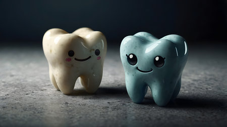Two sad tooth figurines on wooden surface.