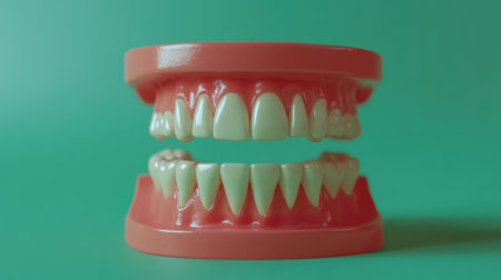 A close-up of a realistic dental model displayed against a soft green backdrop, ideal for educational and dental health visuals