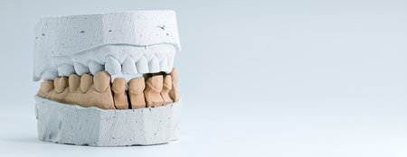 Dental prostheses top view. Jaw models with different problems. Dental disease treatment concept. Plaster models of human prostheses. Dental equipment. Demonstration models of dentures.