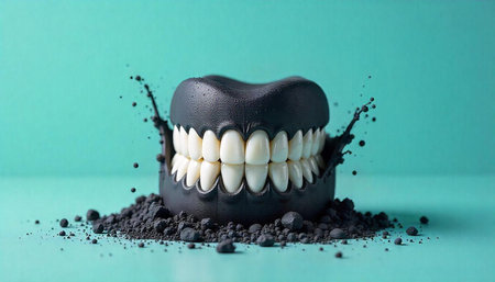 Dental health concept with charcoal teeth and powder explosion