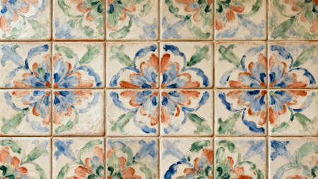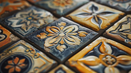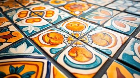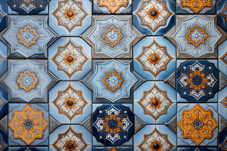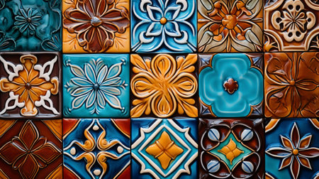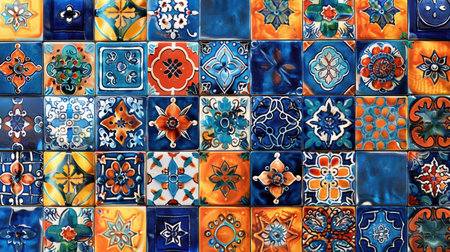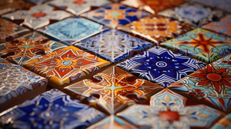 Exotic Moroccan tile background with intricate patterns, vibrant colors, and textured ceramic surfaces. The rich, cultural design adds an element of exotic beauty and craftsmanship to any scene