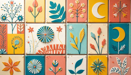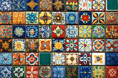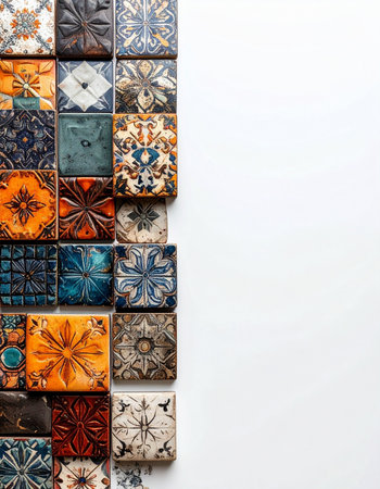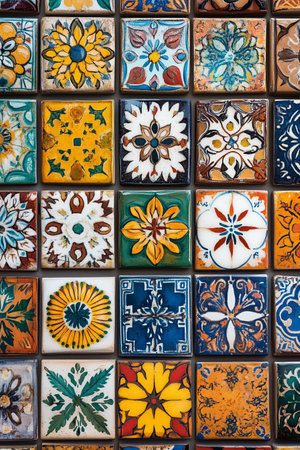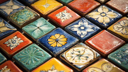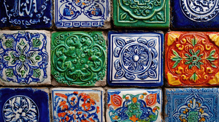 A captivating display of colorful decorative tiles featuring intricate designs, perfect for use in artistic projects or as a stunning backdrop for interior decor.