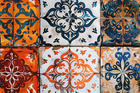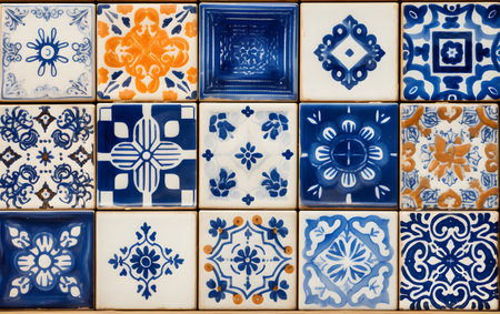 Vibrant and intricate tile patterns showcasing a variety of designs in blue and orange. Perfect for home decor or artistic projects.