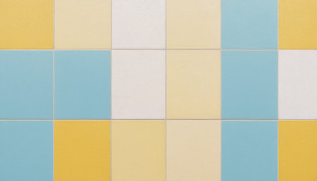 A close-up view of a wall covered in square tiles. The tiles are arranged in a repeating pattern of yellow, light blue, and white. The grout lines are thin and light gray, creating a grid effect. The colors are soft and pastel, giving the surface a cheerful and clean appearance.